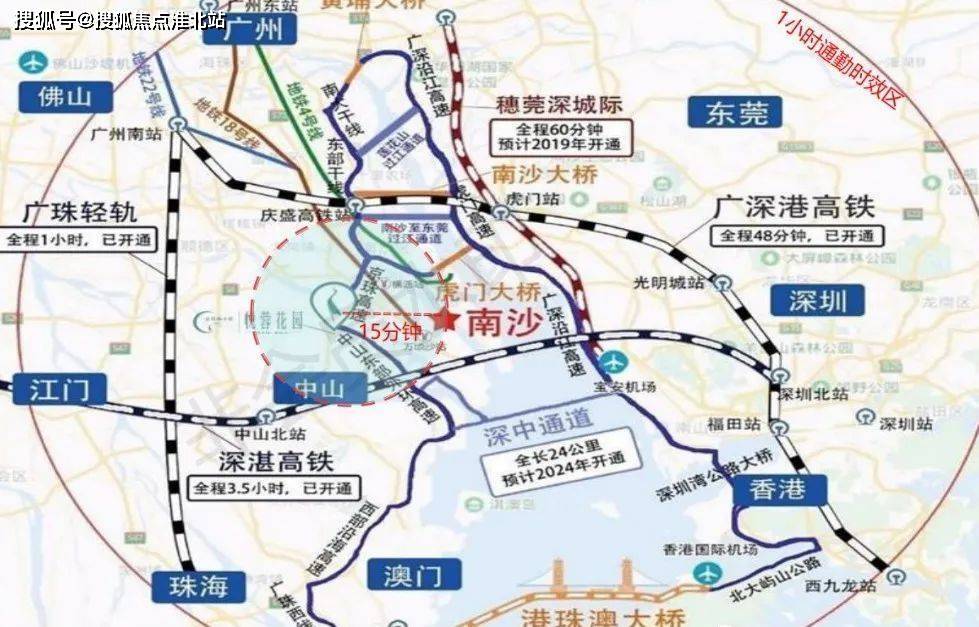 南沙港快速、中江高速、广珠西线互相贯通,至珠三角主要城市时间均在 1 小时以内,去深圳机场、白云机场、珠海机场 1 小时左右。